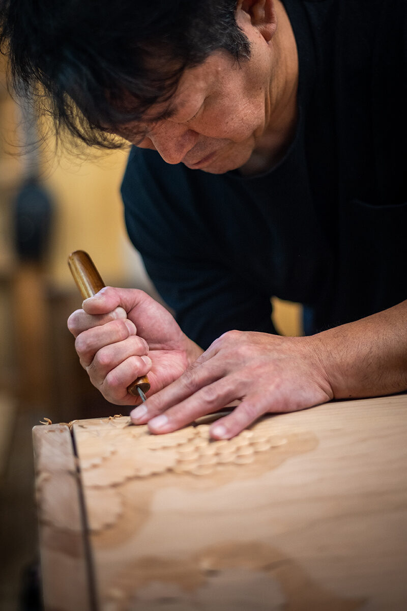飯山仏壇は、独特の「肘木組物(ひじきくみもの)」という技法や金の箔押し、艶やかな蒔絵など、全てにわたって経験豊かな匠や伝統工芸士によって丁寧につくられている、国(経済産業大臣)の指定を受けた伝統的工芸品です。