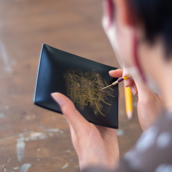 お皿に、お好きな絵柄を漆で描き、金粉や銀粉で仕上げていきます。